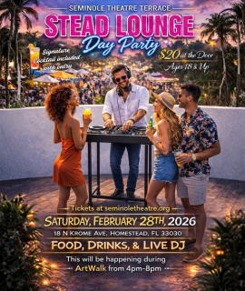 Join us at Seminole Theatre Terrace, 18 N Krome Ave, Homestead, FL 33030 for an unforgettable sunset party experience.
